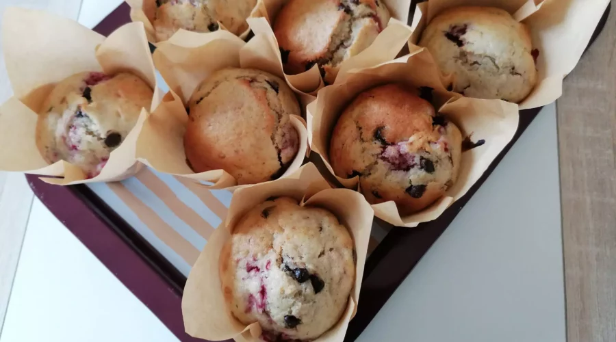 Les muffins choco, banane & framboises
